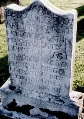 The small headstone is located near the centre of the old churchyard. It is now positioned on a larger modern base stone. The inscription notes that MacKeen was shot by Cornet Douglas, but this is an error. He was shot by the soldiers under Cornet Dundas.