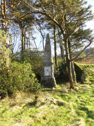 The tall obelisk and small gravestone is located in a small wood to the west of Kirkconnel farm, just off a rough track.