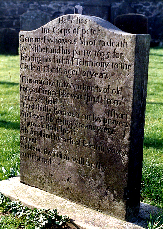 A headstone marks the grave of Peter Gemmel. He was shot at Midland farm (NS 471427) by Lieutenant Nisbet and his dragoons on a Saturday evening in November 1685. He was only 21 years old. Gemmel was one of four who met for a prayer meeting at the farm. They had planned to leave early, as they had information that Nisbet was in the area, but one of their group, was elderly and unfit. Accordingly, they hung back until later. The dragoons appeared, said to be forty strong. They searched the house for over an hour but found no-one. On returning they discovered the Covenanters in the byre. Three were shot in an adjacent field. The other two were John Fergushill and George Woodburn. John Nisbet in Hardhill was wounded seven times, but he was taken away due to their being a reward for his capture.